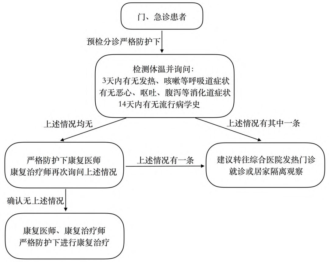 康复医院大部分无发热门诊,因此门、急诊患者筛查流程与综合医院有所差别。康复医院门、急诊患者标准筛查流程