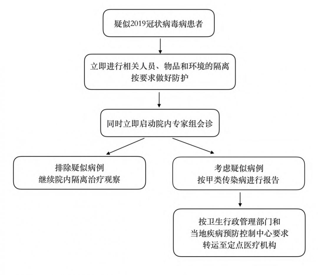 发现疑似或确诊患者,应立即通知医院相关管理部门,联系当地卫生健康行政部门或统一指挥中心,调配转运车辆,转运至定点救治医院,并做好交接记录及终末环境、设备设施消毒工作,对院内相关接触人员隔离观察。